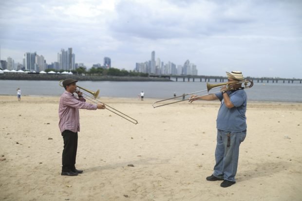 Jaime arroyo (d) y Mario Solis tocan el trombón durante un tributo al fallecido músico estadounidense Willie Colón este domingo, en Ciudad de Panamá (Panamá). EFE/ Bienvenido Velasco