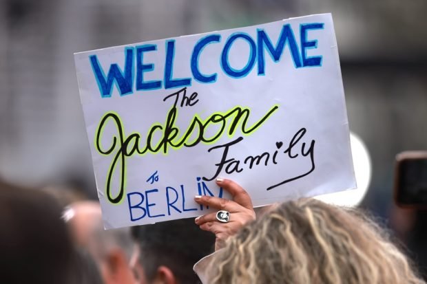 Una invitada sostiene una pancarta que dice «Bienvenidos The Jackson Family a Berlín» cuando llega al estreno de la película ‘Michael’ en Berlín, Alemania, 10 de abril de 2026. La película biográfica de Michael Jackson se proyecta en los cines a partir del 22 de abril de 2026. (Alemania) EFE/EPA/CLEMENS BILAN