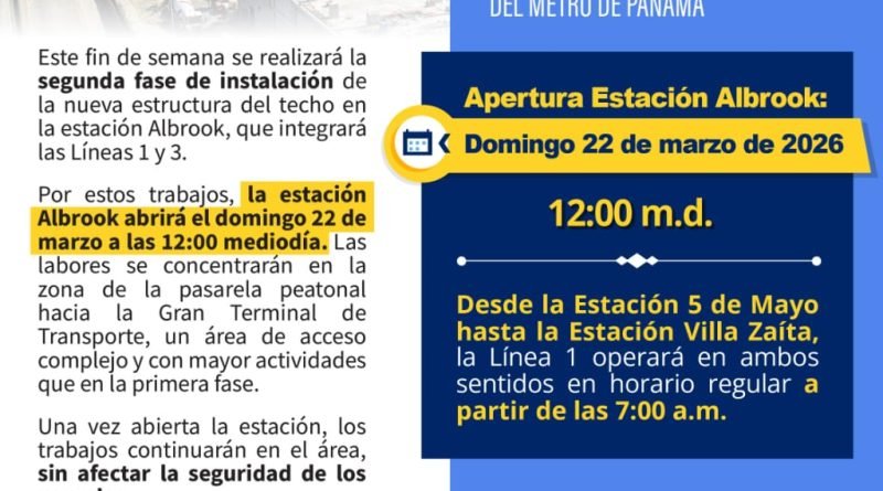 Leer másEl Metro de Panamá informa que este domingo 22 de marzo la estación Albrook iniciará operaciones a partir de las